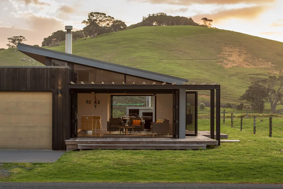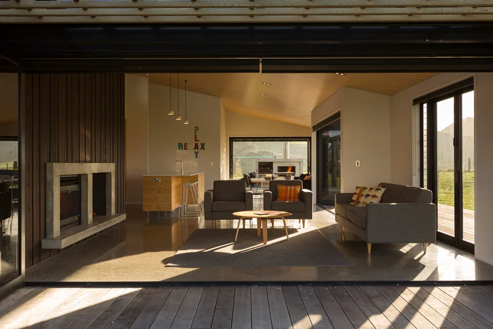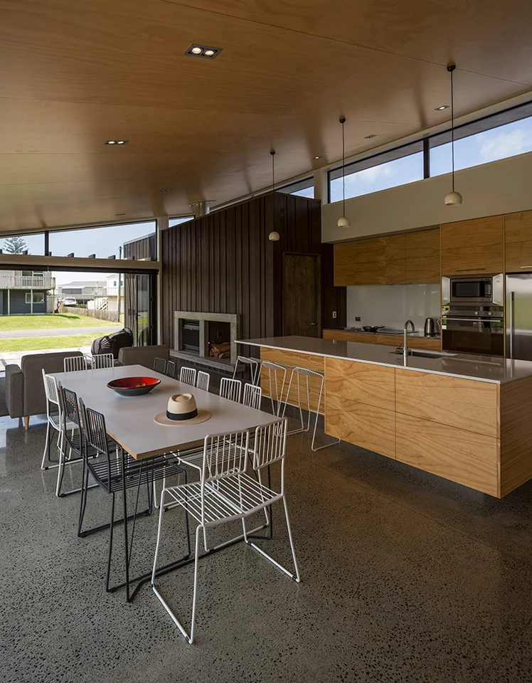 To differentiate the holiday home from a normal house and extend the relaxed atmosphere, there is no formal front door, with guests arriving via a front entrance deck. The garage is akin to a box that slides into the interior of the house, with the variable shiplap cedar cladding carrying through. This wall also acts as a fireplace surround, lending a rustic look to the interior