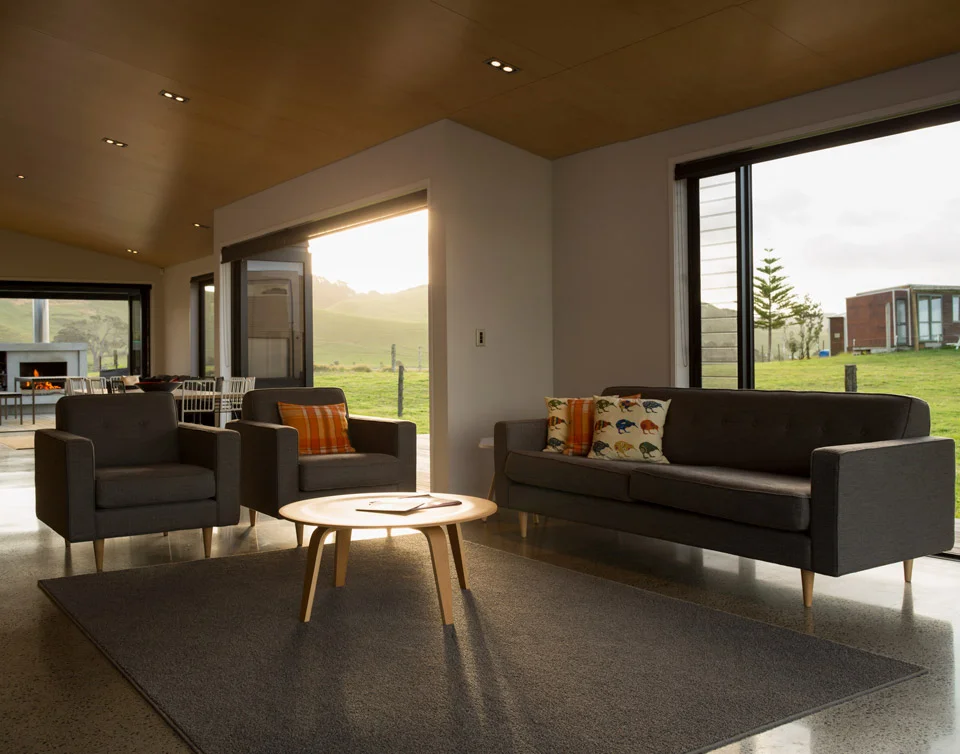 The external cedar cladding is finished in a silver stain that will allow the wood to silver naturally in a uniform way, keeping the holiday home low-maintenance in years to come.